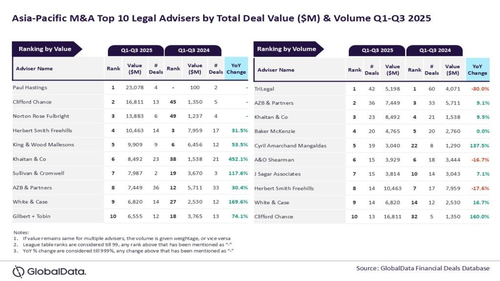 Paul Hastings, TriLegal emerge top Asia-Pacific M&A legal advisers during Q1-Q3 2025