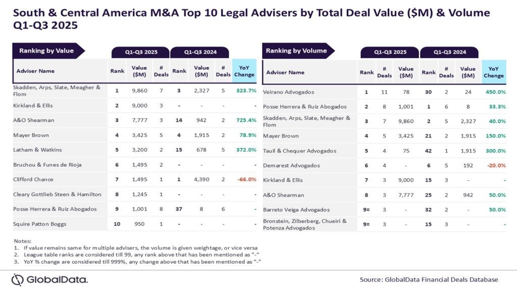 Skadden and Veirano lead legal advisers in South & Central America for Q1-Q3 2025