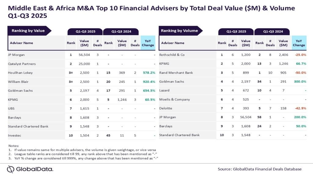 JP Morgan, Rothschild lead financial advisers of MEA region in Q1-Q3 2025