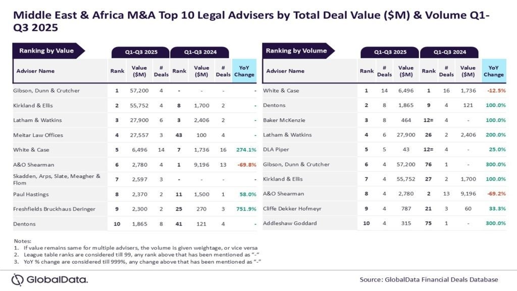 Gibson, Dunn & Crutcher, White & Case top MEA legal advisers in Q1-Q3 2025