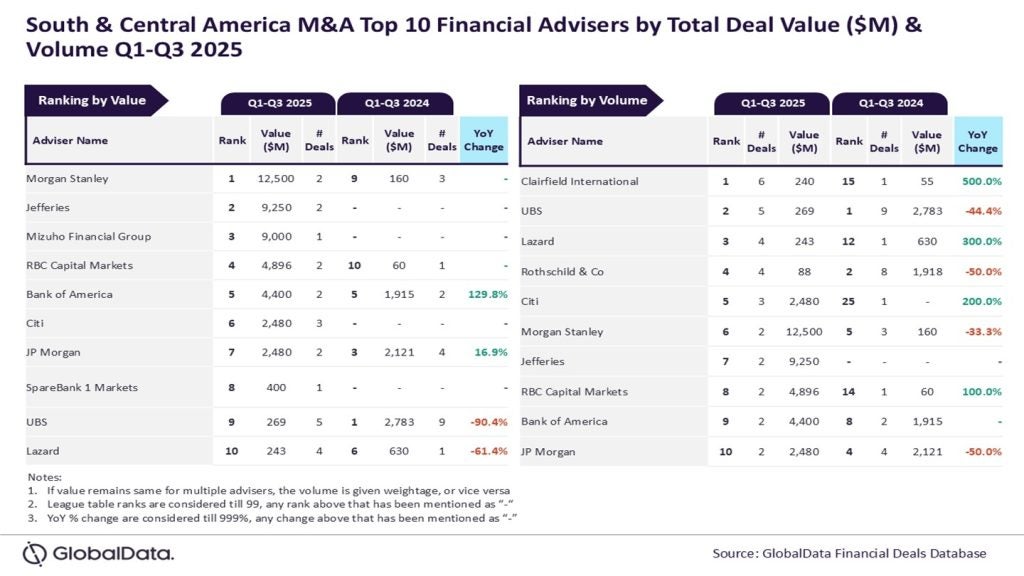 Morgan Stanley, Clairfield International lead financial advisers in South & Central America for Q1-Q3 2025