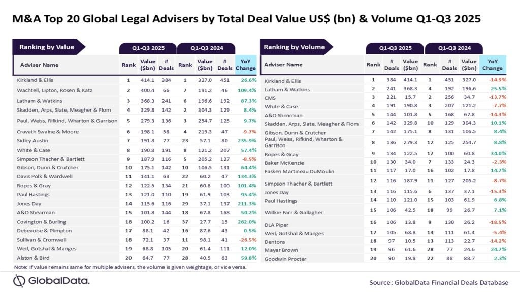 Kirkland & Ellis dominates M&A legal advisory in first three quarters of 2025