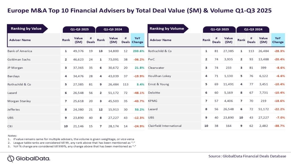 Bank of America, Rothschild & Co dominate Q1-Q3 2025 European M&A advisory