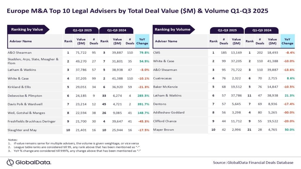 A&O Shearman and CMS top Europe M&A legal advisory rankings for Q1-Q3 2025
