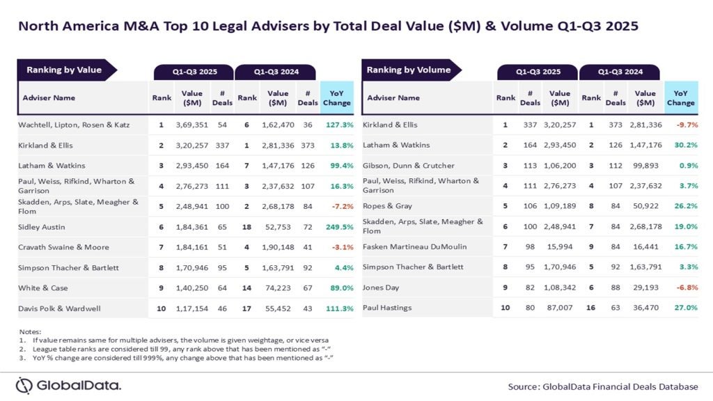 Wachtell, Kirkland emerge top North American M&A legal advisory during Q1-Q3 2025