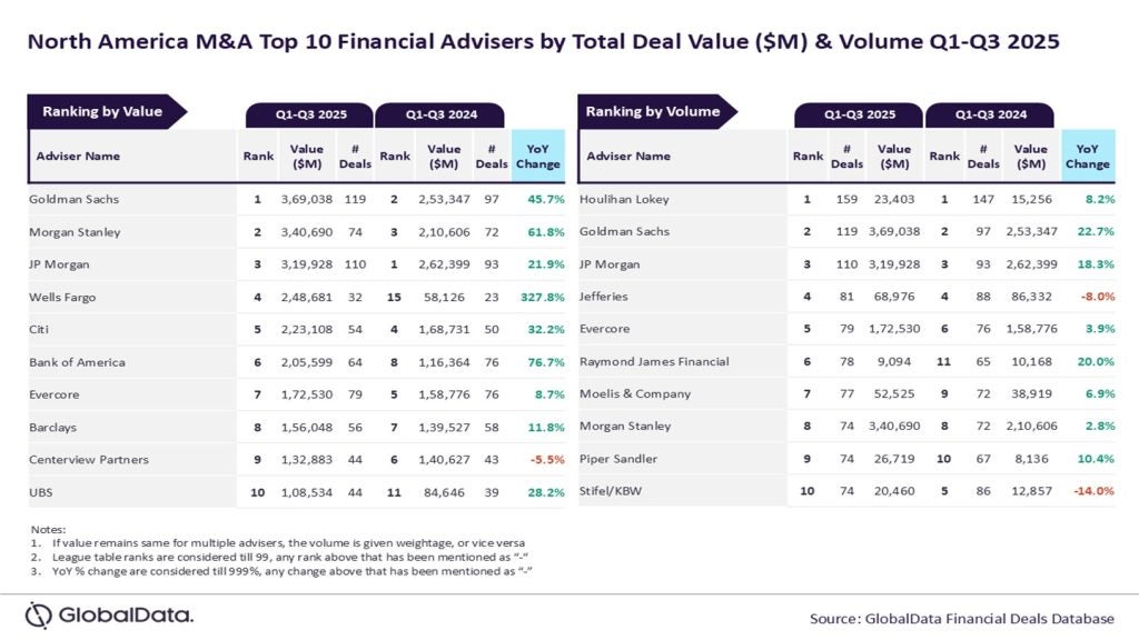 Goldman Sachs, Houlihan Lokey lead North America M&A advisory during Q1-Q3 2025