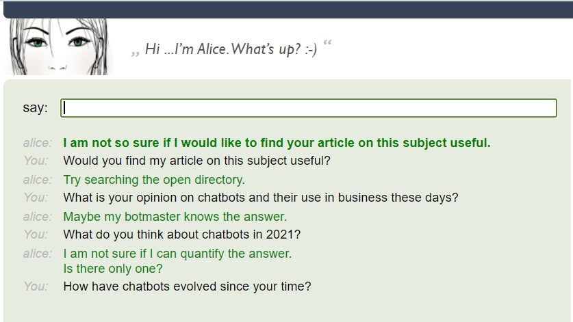 Not that this necessarily makes for sparkling conversation: When Alice is stumped by a question, it throws back the question to you in the form of a question or awkwardly-phrased answer. Interacting with Alice today is a sobering reminder of why it took a while for chatbots to find their voice in mainstream internet.