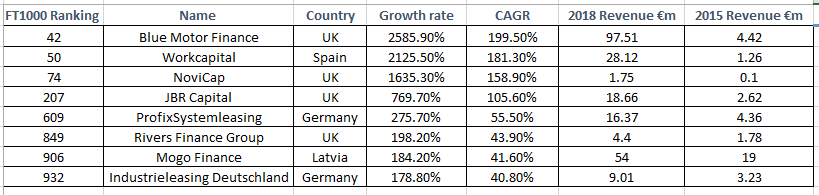 Four of the selection are UK-based companies, Spain and Latvia have one a-piece and Germany claims two. The eight also demonstrate a wide range of revenue takings. The highest earner, Blue Motor Finance, posted revenues of €97.5m in 2018, while the entrant with the lowest revenue for 2018 was NoviCap with €1.75m.