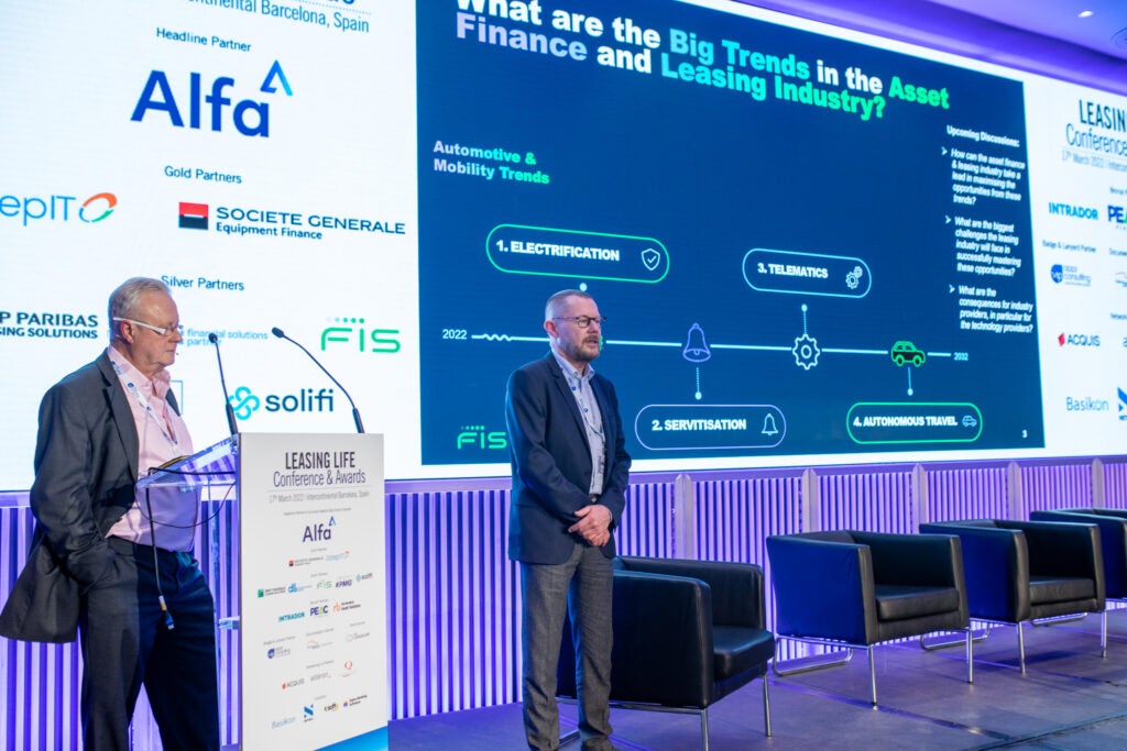 Jeff Andrews of FIS (left) and Simon Harris (Motion Advisory) during their presentation at the Leasing Life Conference in Barcelona in March 2022