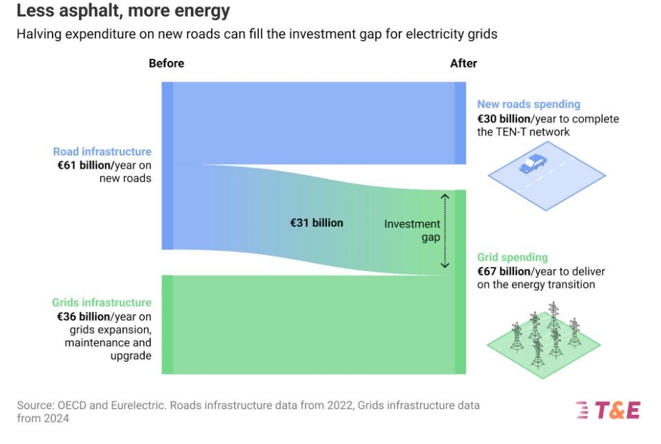 The study highlights the necessity of shifting public investment away from traditional transport infrastructure towards energy grids, charging stations and other green transport support. This pivot is critical, T&E argues, to ensure Europe can decarbonise its road transport sector while staying competitive in the green technology market.