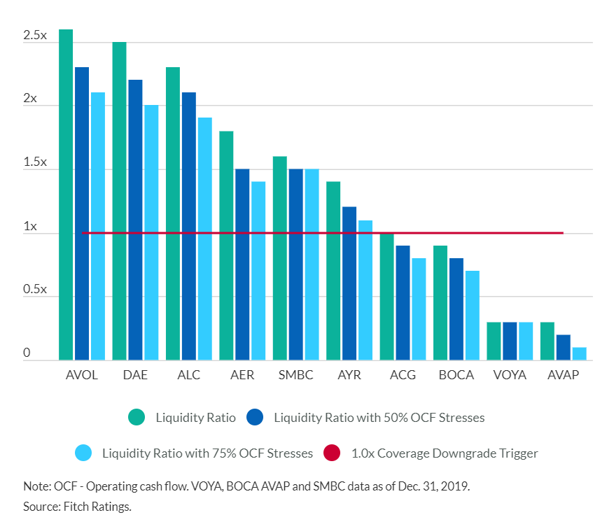 Rated lessors should withstand Fitch’s base case scenario without breaching leverage or liquidity downgrade triggers, given reduced purchase commitments, manageable debt maturities over the next 12 months, and, in some cases, recent draws on available borrowing capacity, the rating agency said.