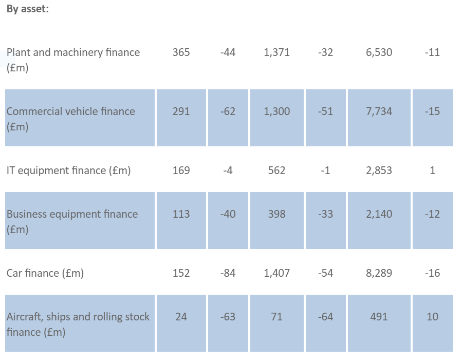 Over the same period, the business equipment finance and plant and machinery finance sectors reported falls in new business of 40% and 44% respectively.