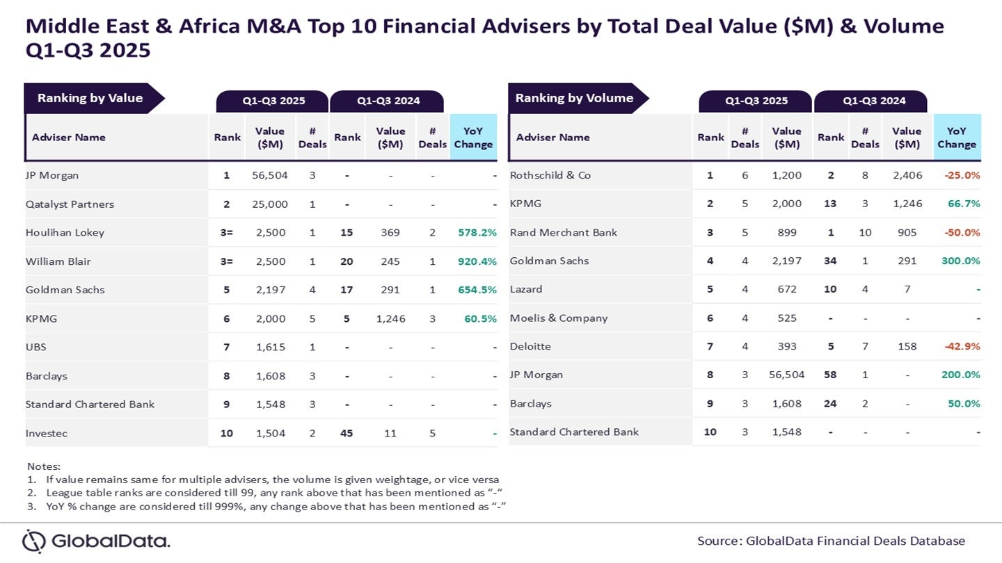JP Morgan and Rothschild & Co have emerged as the top mergers and acquisitions (M&A) financial advisers in the Middle East & African (MEA) region during the first three quarters (Q1-Q3) of 2025 by value and volume, respectively.