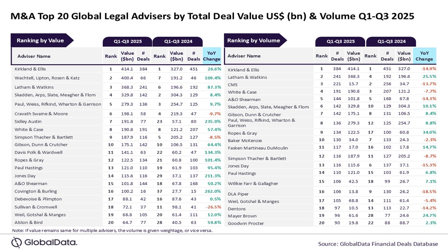 GlobalData lead analyst Aurojyoti Bose said: “Kirkland & Ellis was also the top adviser during Q1-Q3 2024 by both value and volume. The Chicago-based law firm outpaced its peers by a significant margin in terms of volume. In fact, it was the only adviser that managed to advise on more than 300 deals during Q1-Q3 2025.