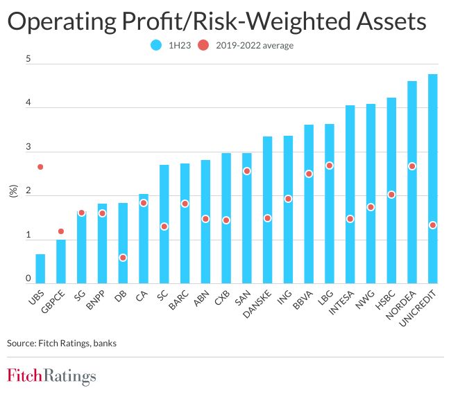 Most of the 20 large banks in Fitch’s latest quarterly credit tracker reported 1H23 operating profit/risk-weighted asset ratios well above their 2019–2022 averages as asset repricing on higher interest rates outpaced rising funding costs.