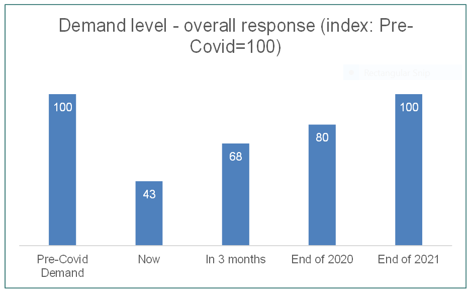 Demand in June has dropped to 40% of pre-Covid levels and is expected to rise to 80% by the end of 2020 before returning to pre-Covid levels by the end of 2021, the survey found.