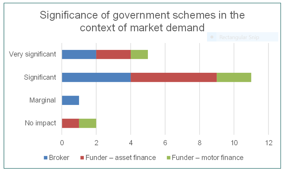 Almost all asset finance providers in the study considered government schemes (such as CBILS) to be “significant” or “very significant” in context of current market demand, with most either accredited or seeking accreditation.