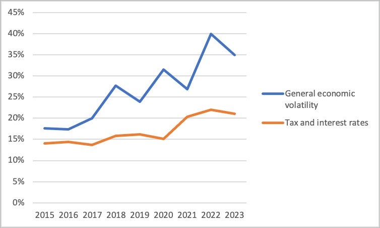 Market volatility, identified as the primary concern by 35% of respondents in Q1 2024, has seen a slight decrease from its peak in Q1 2022. Despite this, the figure remains approximately double the level recorded eight years ago, indicating the lasting effects of economic uncertainties.