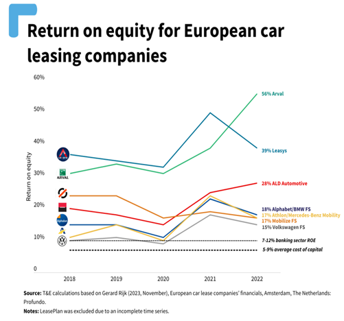 Profits of Europe’s major leasing companies have grown by 59% from 2018 to 2022 even though their fleet sizes only grew by 5%. A new report by research organisation Profundo and commissioned by T&E looks at the profitability of Europe’s seven largest leasing companies (ALD | LeasePlan, Alphabet/BMW Financial Services, Arval, Leasys, Mercedes-Benz Mobility/Athlon, Mobilize Financial Services, and Volkswagen Financial Services) and finds that it reached a combined €15.7 billion in 2022.