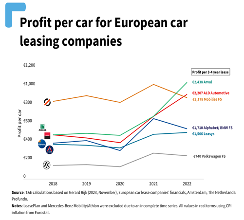 The report indeed finds that on average the profit per car has risen by 53% from 2018 to 2022 for the selected leasing companies, meaning customers are paying much more than four years ago. Indeed, the fleet sizes of leasing companies have only increased by 5% in the last few years.