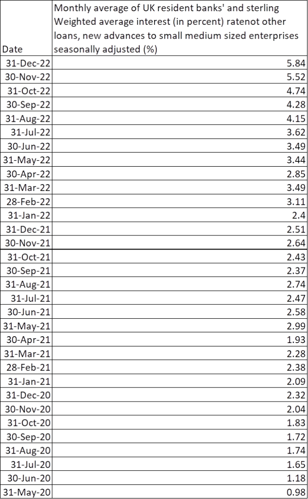 UK small businesses face surging interest rates on lending, with the average rate on new bank loans written increasing fivefold from just 0.98% in May 2020 to 5.84% in December 2022, says UHY Hacker Young, the accountancy group.