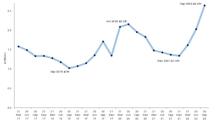 The value of interest rate swaps held by banks in the UK reached £2.6 trillion on 30 September 2022, up 93% from £1.3tn in just nine months, from 31 December 2021, as businesses rushed to protect themselves against interest rate rises, said ACP Altenburg Advisory, a debt advisory specialist. That is the highest value for interest rate swaps held by banks since 2013.